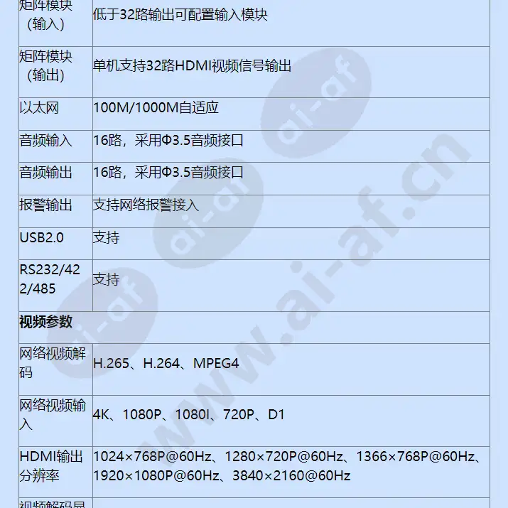PM60MC-32H-HSS 32路高清网络数字矩阵是一款技术先进、功能实用、使用便捷的高清网络上墙设备。本完善、稳定可靠、操作简单,直接连接显示设备输出,适合于绝大多数要求图像解码上电视墙的网络视频安防场合 PM60MC-32H-HSS 32路高清网络数字矩阵可以将前端高清网络摄像机或平台软件通过网络传过来的压缩视频数据解码还原为高清数字信号输出至显示设备上。支持图像巡视、成组、分割、成组等多种显示方式,可以实现实时语音对讲,报警联动等功能。编解码方式支持H.265、H.264、MPEG4等,支持4K解码显示 支持网络媒体数据接入 单机箱最大支持32路HDMI视频输出 最高支持3840x2160@60Hz视频输出 支持标准H.265、H.264、MPEG4码流 支持视频输出分割显示,最大支持单屏64分割显示 支持预案设定和预案管理 支持智能网络通讯(插卡式机箱) 支持智能连接 支持报警联动及报警开关输出功能(固化式两路仅支持报警联动、MB2不支持报警输出) 支持多条标题编辑,位置可灵活配置 单板支持1/4路HDMI输入(插卡式机箱选配) 支持多种分辨率,可手动改变输出分辨率 支持4K、1080P、1080I、720P、D1等视频格式 单模块支持2/4路4K或16路1080P或36路720P解码显示 支持图像巡视、成组、分割、拼接等显示 支持视频优化,对摄像机不流畅及网络造成卡顿有显著效果 支持主从智能数据同步(插卡式机箱) 支持音频输入、输出,可实现广播、对讲等应用需求 支持OSD功能,可叠加标题、系统信息、告警信息等 指标 参数 型号 PM60MC-32H-HSS 描述 32 路高清网络数字矩阵 模块接口参数 矩阵模块(输入) 低于32路输出可配置输入模块 矩阵模块(输出) 单机支持32路HDMI视频信号输出 以太网 100M/1000M 自适应 音频输入 16 路,采