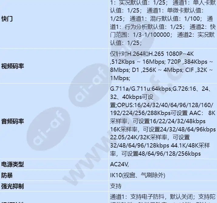 支持全结构化、行为分析、人群态势分析、目标、人体、机非人、车辆、车辆事件检测、交通数据统计; 支持背光自适应、透雾自适应; 采用1/1.8" CMOS; 软件定义,支持算法在线加载与升级; 数字宽动态超级宽动态,强反差场景还原真实细节; 双镜4MP高清设计,全景和细节兼顾; 超感光成像技术,无光低照全彩,很好图像体验; 双层AR增透膜,透光性能增强; 内置AI ISP视频流降噪技术,视频图像增强; 具备非接触式自清洁装置,无水源可正常工作; 车辆 中国大陆牌识别,车牌增强,车身颜色检测,车型检测,车款检测 车辆事件检测 机占非检测,非占机检测,违法停车检测,逆行/倒车检测,违停检测 交通数据统计 车流量统计,非机动车流量统计,行人统计 行为分析视频模式 快速移动检测,越线检测,入侵检测,区域进入/离开检测,徘徊检测 人群态势分析 排队长度统计,区域人数统计,在离岗检测 人体 人体检测,人体属性检测 机非人 机非人检测,骑行人属性检测 分辨率 定焦:4MP 2560(H)*1440(V) 变焦:4MP 2560(H)*1440(V) Sensor感光面尺寸 1 / 1.8英寸CMOS 最低照度 彩色:0.0003Lux (F1.2,AGC ON,1/30快门) 黑白:0.0001Lux (F1.2,AGC ON,1/30快门), 0Lux(红外开启) 镜头焦距 最小焦距:5mm最大焦距:208mm 镜头视角 定焦:水平:90°,垂直:48° 变焦:W:水平20.7° ;T:水平2.31° 视场角公差≤5% 红外灯补光距离 200m 白光灯补光距离 30m 视频编码格式 MJPEG / H.264 / H.265 视频帧率 细节:30/25fps可设置; 全景:30/25fps可设置 音频编码格式 G.711a/G.711u/G.726/OPUS/AAC 云台旋转角度 水平