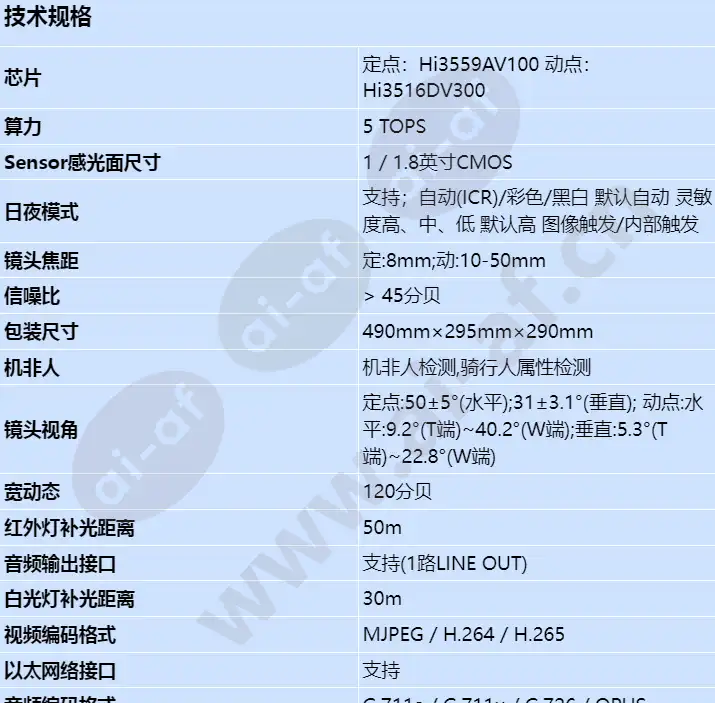 支持5 TOPS算力; 支持全结构化、1拖N功能、多算法切换、行为分析、人群态势分析、目标、人体、机非人、车辆、车辆事件检测、交通数据统计; 支持背光自适应、透雾自适应、速度自适应; 采用1/1.8" CMOS; 软件定义,支持算法在线加载与升级; 120dB超级宽动态,强反差场景还原真实细节; 支持全结构化; 车辆 中国大陆牌识别,车牌增强,车身颜色检测,车型检测,车款检测 车辆事件检测 机占非检测,非占机检测,违法停车检测,逆行/倒车检测 交通数据统计 车流量统计,非机动车流量统计,行人统计 行为分析 快速移动检测,越线检测,入侵检测,区域进入/离开检测,徘徊检测 人群态势分析 排队长度统计,区域人数统计,人流量统计 目标 目标检测,目标抓拍增强,目标属性检测 人体 人体检测,人体属性检测 机非人 机非人检测,骑行人属性检测 芯片 定点:Hi3559AV100 动点:Hi3516DV300 算力 5 TOPS Sensor感光面尺寸 1 / 1.8英寸CMOS 最低照度 彩色:0.0004Lux(F1.2,AGC ON,1/30快门),黑白:0.0001Lux(F1.2,AGC ON,1/30快门) 镜头焦距 定:8mm;动:10-50mm 镜头视角 定点:50±5°(水平);31±3.1°(垂直); 动点:水平:9.2°(T端)~40.2°(W端);垂直:5.3°(T端)~22.8°(W端) 红外灯补光距离 50m 白光灯补光距离 30m 视频编码格式 MJPEG / H.264 / H.265 视频帧率 30/25fps可设置,默认值25fps 音频编码格式 G.711a / G.711u / G.726 / OPUS 云台旋转角度 水平:-5°~185°(以光耦零点为0°坐标), 垂直:-5°~45° 云台水平速度 水平0.1°~240°/S 云台垂直速度 垂直
