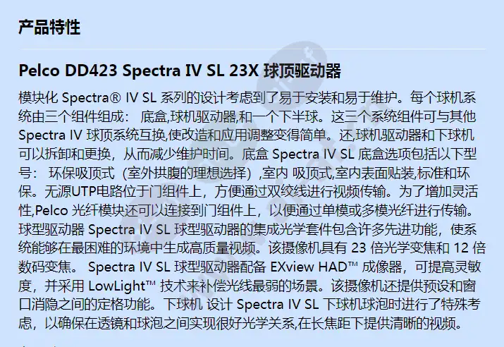 Pelco DD423 Spectra IV SL 23X 球顶驱动器 模块化 Spectra® IV SL 系列的设计考虑到了易于安装和易于维护。每个球机系统由三个组件组成: 底盒,球机驱动器,和一个下半球。这三个系统组件可与其他 Spectra IV 球顶系统互换,使改造和应用调整变得简单。还,球机驱动器和下球机可以拆卸和更换,从而减少维护时间。底盒 Spectra IV SL 底盒选项包括以下型号: 环保吸顶式(室外拱腹的理想选择),室内 吸顶式,室内表面贴装,标准和环保。无源UTP电路位于门组件上,方便通过双绞线进行视频传输。为了增加灵活性,Pelco 光纤模块还可以连接到门组件上,以便通过单模或多模光纤进行传输。球型驱动器 Spectra IV SL 球型驱动器的集成光学套件包含许多先进功能,使系统能够在最困难的环境中生成高质量视频。该摄像机具有 23 倍光学变焦和 12 倍数码变焦。 Spectra IV SL 球型驱动器配备 EXview HAD™ 成像器,可提高灵敏度,并采用 LowLight™ 技术来补偿光线最弱的场景。该摄像机还提供预设和窗口消隐之间的定格功能。下球机 设计 Spectra IV SL 下球机球泡时进行了特殊考虑,以确保在透镜和球泡之间实现很好光学关系,在长焦距下提供清晰的视频。 主要特征: 自动对焦,高分辨率集成 LowLight™ 彩色摄像机/光学套件 早晚, 540电视线 23 倍光学变焦 窗口消隐 摄像机标题叠加,20个用户自定义字符 屏幕罗盘和倾斜显示 密码保护 在预设期间冻结帧 内置浪涌和有限雷电保护 集成无源非屏蔽双绞线 (UTP) 电路 内部调度时钟 能够通过购买可选的 TXB-IP 模块来添加 IP 网络功能 摄像机风格: PTZ Compliance: 符合国防授权法案 光学变焦: 23倍光学变焦