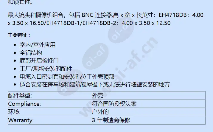 Pelco EH4718DB 外壳户外落地 Pelco EH4712DB/EH4718DB 系列环境外壳由压铸和挤压铝制成,旨在取代我们的 EH4600 系列外壳。 EH4718DB 外壳可接受带有固定焦距镜头或电动变焦镜头的闭路电视摄像机。带有工厂安装的加热器和鼓风机的型号具有带内部电子元件的预接线 PC 板,可简化摄像机和外壳配件的安装和设置。 与其他闭路电视外壳不同,Pelco EH4718DB 系列从底部打开,摄像机滑橇安装在外壳顶部。可以在不干扰视频的情况下进行内部调整,因为摄像机保持在正常观看位置。 电缆入口密封套和安装孔位于外壳顶部,使其成为天花板应用的理想选择,尤其是在可访问性有限的情况下。 EH4718DB 系列外壳配有工厂安装的加热器和鼓风机。可选的现场安装配件包括车窗除霜器,预设定位镜头线束,120 VAC 电源插座和锁套件。 最大镜头和摄像机组合,包括 BNC 连接器,高 x 宽 x 长英寸:EH4718DB:4.00 x 3.50 x 16.50/EH4718DB-1/EH4718DB-2:4.00 x 3.50 x 12.50 主要特征: 室内/室外应用 全铝结构 底部开启检修门 工厂/现场安装的配件 电缆入口密封套和安装孔位于外壳顶部 适合安装在停车场和建筑物屋檐下或无法进行墙壁安装的地方 配件类型: 外壳 Compliance: 符合国防授权法案 Environmental: 户外的 Warranty: 3 年制造商保修
