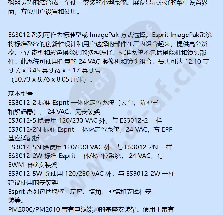 Pelco ES3012-2W 派尔高护罩云台一体机 ES3012 系列一体化定位系统 ESPRIT® 高性能云台,可同轴视控 (COAXITRON®) • 集解码器、云台,和不外露导线的防护罩为一体 • 可选的 ImagePak® 一体化光学组件 • 接线快速而简捷 • 可变速度 – 高级变速电机技术 • 360° 连续水平转动 • 区域屏蔽 – 可以设置 8 个区域(区域大小可设置)并可以设置成盲区 • 可在 90 mph 风速下正常工作,能承受最大风速达到 130 mph • 在风速 50 mph 时的水平预置速度为 100°/ 秒,在风速 90 mph 时为50°/ 秒 • 垂直转动范围:自水平方向 +33° 至 -83° • 预置位 • 低维护设计,无需调整齿轮 • 轻铝结构 • 符合 NEMA 类型 4X 和 IP66 标准 Pelco 的 Esprit® ES3012 系列 一体化定位系统 将一个云台,防护罩和解码器灵巧的结合成一个便于安装的小型系统。屏幕显示友好的菜单设置界面,方便用户设置和使用。 ES3012 系列可作为标准型或 ImagePak 方式选择。Esprit ImagePak系统将标准系统的创新性设计和用户选择的部件在厂内组合起来。提供高分辨率、昼/ 夜型和彩色摄像机的多种选择。标准系统不包括摄像机和镜头部件。此系统可使用任意的 24 VAC 摄像机和镜头组合,最大可达 12.10 英寸长 x 3.45 英寸宽 x 3.17 英寸高 (30.73 x 8.76 x 8.05 厘米)。 基本型号 ES3012-2 标准 Esprit 一体化定位系统(云台,防护罩 和解码器), 24 VAC,无安装架 ES3012-5 除使用 120/230 VAC 外,与 ES3012-2 一样 ES3012-2N 标准 Esprit 一体化定位系统,24