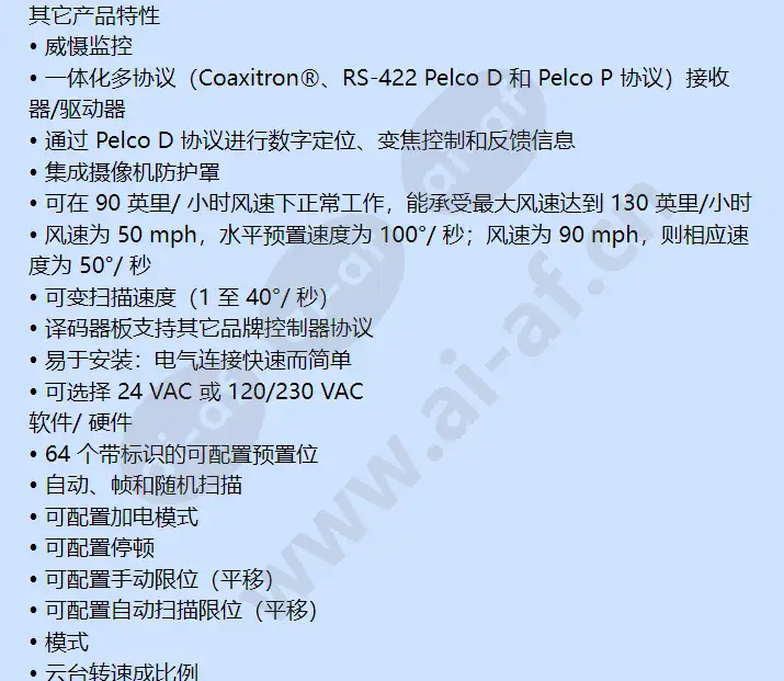 ES30C22-2W-X派尔高 Pelco模拟一体云台IOP摄像机 ES30C/ES31C 系列定位系统 ESPRIT® 系统带有 IOP 摄像机和雨刷器选件 • 接收器、云台以及带有一体化光学组件 (IOP) 的防护罩 • 可配置的摄像机设置 • 可配置的摄像机标题 • 屏幕可显示水平方位、倾斜角度和变焦倍数 • 自动光圈,手动优先 • 自动聚焦,手动优先 • 交流线锁 • 水平变速旋转:0.1 度/ 秒至 100 度/ 秒,成比例水平旋转 • 360° 连续水平旋转 • 区域屏蔽允许将最多 8 个区域(可配置大小)设置成输出空白视频 • 倾斜范围:自水平方向 +33° 至 -83° • 支持预置位、自动巡检模式和多种扫描模式 • 低维护设计,无需调整齿轮 • 宽动态范围(仅 35X) 其它 • 威慑监控 • 一体化多协议(Coaxitron®、RS-422 Pelco D 和 Pelco P 协议)接收器/驱动器 • 通过 Pelco D 协议进行数字定位、变焦控制和反馈信息 • 集成摄像机防护罩 • 可在 90 英里/ 小时风速下正常工作,能承受最大风速达到 130 英里/小时 • 风速为 50 mph,水平预置速度为 100°/ 秒;风速为 90 mph,则相应速度为 50°/ 秒 • 可变扫描速度(1 至 40°/ 秒) • 译码器板支持其它品牌控制器协议 • 易于安装:电气连接快速而简单 • 可选择 24 VAC 或 120/230 VAC 软件/ 硬件 • 64 个带标识的可配置预置位 • 自动、帧和随机扫描 • 可配置加电模式 • 可配置停顿 • 可配置手动限位(平移) • 可配置自动扫描限位(平移) • 模式 • 云台转速成比例 • 8 个区域(区域大小可配置),每个区域可带最多 20 个字符的标识 • 8 个区域(区域大小可配置)可设置为输出空白视频