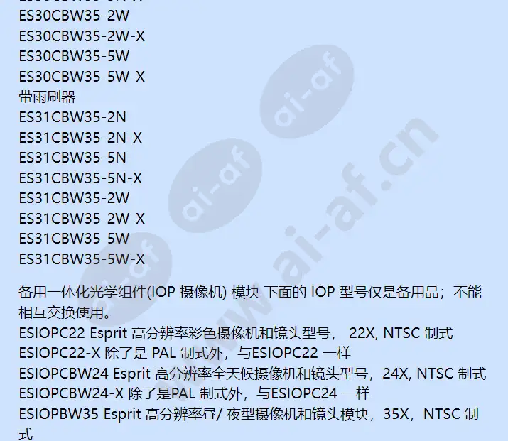 ES30CBW24-5N-X 派尔高 Pelco模拟一体云台IOP摄像机 ES30C/ES31C 系列定位系统 ESPRIT® 系统带有 IOP 摄像机和雨刷器选件 • 接收器、云台以及带有一体化光学组件 (IOP) 的防护罩 • 可配置的摄像机设置 • 可配置的摄像机标题 • 屏幕可显示水平方位、倾斜角度和变焦倍数 • 自动光圈,手动优先 • 自动聚焦,手动优先 • 交流线锁 • 水平变速旋转:0.1 度/ 秒至 100 度/ 秒,成比例水平旋转 • 360° 连续水平旋转 • 区域屏蔽允许将最多 8 个区域(可配置大小)设置成输出空白视频 • 倾斜范围:自水平方向 +33° 至 -83° • 支持预置位、自动巡检模式和多种扫描模式 • 低维护设计,无需调整齿轮 • 宽动态范围(仅 35X) 其它 • 威慑监控 • 一体化多协议(Coaxitron®、RS-422 Pelco D 和 Pelco P 协议)接收器/驱动器 • 通过 Pelco D 协议进行数字定位、变焦控制和反馈信息 • 集成摄像机防护罩 • 可在 90 英里/ 小时风速下正常工作,能承受最大风速达到 130 英里/小时 • 风速为 50 mph,水平预置速度为 100°/ 秒;风速为 90 mph,则相应速度为 50°/ 秒 • 可变扫描速度(1 至 40°/ 秒) • 译码器板支持其它品牌控制器协议 • 易于安装:电气连接快速而简单 • 可选择 24 VAC 或 120/230 VAC 软件/ 硬件 • 64 个带标识的可配置预置位 • 自动、帧和随机扫描 • 可配置加电模式 • 可配置停顿 • 可配置手动限位(平移) • 可配置自动扫描限位(平移) • 模式 • 云台转速成比例 • 8 个区域(区域大小可配置),每个区域可带最多 20 个字符的标识 • 8 个区域(区域大小可配置)可设置为输出空白视