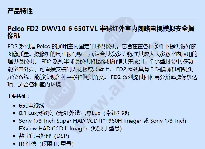 Pelco FD2-DWV10-6 650TVL 半球红外室内闭路电视模拟安全摄像机 FD2 系列是 Pelco 的通用室内固定半球摄像机。它旨在在各种条件下提供很好的图像质量。摄像机的尺寸很有吸引力,结合其众多功能,使其成为大多数室内应用的理想摄像机。 FD2 系列半球摄像机将摄像机和镜头集成到一个小型封装中,多功能室内外壳,可直接安装到天花板或墙壁上。 FD2 系列具有 3 轴摄像机和镜头定位系统,能够实现各种平移和倾斜角度。 FD2 系列提供四种高分辨率摄像机选项,适合各种室内环境: 主要特征: 650电视线 0.1 Lux灵敏度(无红外线),零Lux(带红外线) Sony 1/3-Inch Super HAD CCD II™ 960H Imager 或 Sony 1/3-Inch EXview HAD CCD II Imager(取决于型号) 数字信号处理(DSP) IR 补偿(仅限 IR 型号) 固定或变焦镜头 自动感应电源; 18 至 32 VAC/12 VDC,带内部同步(修订版 A) 通过 Coaxitron 的远程访问能力(基于模型) 报警输出(基于型号) 已完全组装发货,易于安装 • 宽动态范围和日/夜 DSS 球顶:具有高分辨率 (650 TVL),带有自动光圈变焦镜头的日/夜摄像机。该摄像机采用 WDR 传感器技术,提供 120 dB 动态范围。即使监控区域内的照明条件截然不同,该技术也有助于捕获出色的视觉图像。通过移除红外截止滤光片,摄像机还可以在低光环境下自动从彩色模式切换到单色模式,数字慢速快门 (DSS) 可实现极低光照能力。这些使得这款摄像机成为需要极高灵敏度和动态范围的困难且不平衡照明条件的应用的理想解决方案。 • 红外照明高分辨率半球:配备带有固定或变焦镜头的高分辨率 (650 TVL) 彩色摄像机。红外摄像头选项配备高性能红外补偿。该