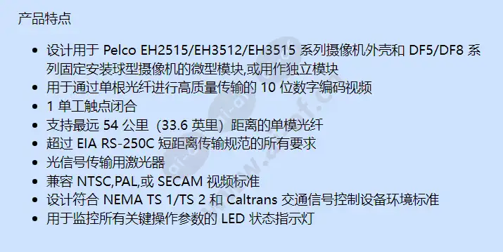 FTV10S1STM 微型光纤发射器允许通过一根光纤传输一个复合视频通道。 FTV10S1STM 发射器与 FRV20 系列接收器兼容。 FTV10S1STM 发射器提供单模版本。使用单模光纤时,FTV10S1STM 发射器和兼容接收器提供高达 16 dB 的光功率预算,并提供高达 54 公里(33 英里)的传输距离。 即插即用设计确保易于安装,无需进行电气或光学调整。专门设计用于 EH2515/EH3512/EH3515 系列摄像机防护罩和 DF5/DF8 系列固定式半球摄像机, FTV10S1STM 发射器也可以用作独立模块。作为独立模块,该装置可以放置在桌面上,也可以安装在墙上。适用于独立式和壁挂式安装,FTV10S1STM 发射器需要外部电源。该装置可以使用推荐的 FEXTPS 光纤外部电源供电。 产品特点 设计用于 Pelco EH2515/EH3512/EH3515 系列摄像机外壳和 DF5/DF8 系列固定安装球型摄像机的微型模块,或用作独立模块 用于通过单根光纤进行高质量传输的 10 位数字编码视频 1 单工触点闭合 支持最远 54 公里(33.6 英里)距离的单模光纤 超过 EIA RS-250C 短距离传输规范的所有要求 光信号传输用激光器 兼容 NTSC,PAL,或 SECAM 视频标准 设计符合 NEMA TS 1/TS 2 和 Caltrans 交通信号控制设备环境标准 用于监控所有关键操作参数的 LED 状态指示灯