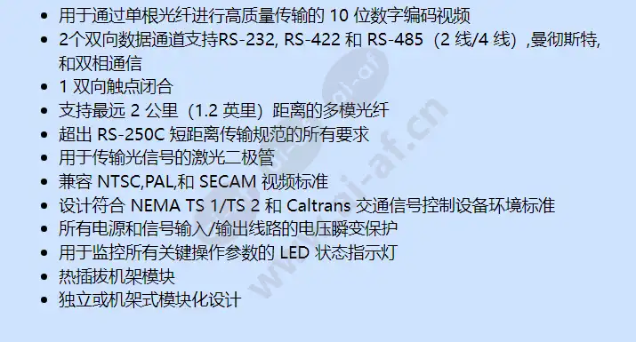 FTV40D2M1ST 是一款光纤发射器,采用两槽宽设计,通过一根光纤传输四个通道的单向视频、两个通道的双向数据和一个双向触点闭合。 FTV40D2M1ST 发射器提供多模式版本。 FTV40D2M1ST 即插即用设计确保易于安装,无需进行电气或光学调整。 FTV40D2M1ST 装置采用模块化设计,可使用 EURACK/USRACK 机箱进行机架安装,也可将独立模块放置在桌面上或安装到墙壁上(不需要壁挂套件)。 适用于独立式和壁挂式安装,FTV40D2M1ST 装置需要外部电源。该装置可以使用推荐的 FEXTPS 光纤外部电源供电。 产品特点 用于通过单根光纤进行高质量传输的 10 位数字编码视频 2个双向数据通道支持RS-232, RS-422 和 RS-485(2 线/4 线),曼彻斯特,和双相通信 1 双向触点闭合 支持最远 2 公里(1.2 英里)距离的多模光纤 超出 RS-250C 短距离传输规范的所有要求 用于传输光信号的激光二极管 兼容 NTSC,PAL,和 SECAM 视频标准 设计符合 NEMA TS 1/TS 2 和 Caltrans 交通信号控制设备环境标准 所有电源和信号输入/输出线路的电压瞬变保护 用于监控所有关键操作参数的 LED 状态指示灯 热插拔机架模块 独立或机架式模块化设计