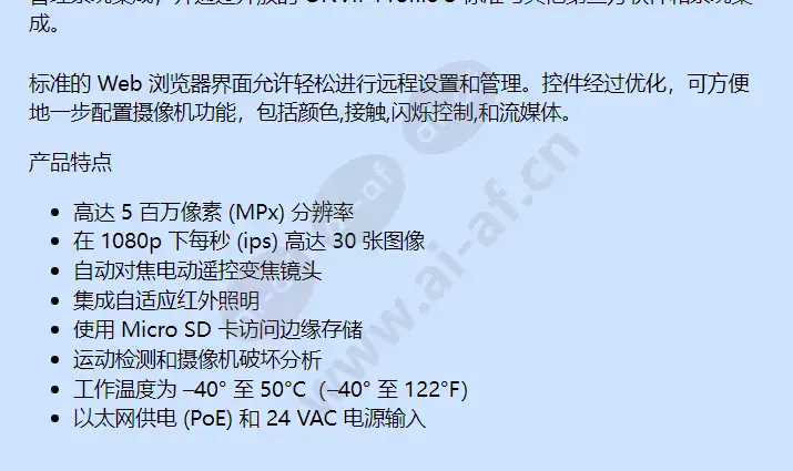 IBP1110-ER 子弹头摄像机最多支持 2 个同步视频流和第三个服务流。这 2 个流可以使用高效的 H.264 High 或 Main 配置文件或 MJPEG 格式进行压缩。流可以配置为各种帧速率和比特率,以优化图像质量以及带宽和存储效率。 此外,该摄像机具有带微型 SD 卡(单独出售)的板载边缘存储。报警时可将不同长度的视频片段存储到卡中,或者在网络中断的情况下可以将视频连续写入SD卡。可以通过 FTP 协议从卡中检索视频。 简单的运动检测算法允许摄像机在选定区域或整个场景中检测到运动时记录或触发警报。如果镜头被遮挡或摄像机被重新定位,则会触发摄像机破坏警报。它无缝连接到 Pelco 视频管理系统,例如 Endura 2.0 版(或更高版本)和 Digital Sentry 7.3 版(或更高版本)。它还通过开放的 Pelco API 与主要的第三方视频管理系统集成,并通过开放的 ONVIF Profile S 标准与其他第三方软件和系统集成。 标准的 Web 浏览器界面允许轻松进行远程设置和管理。控件经过优化,可方便地一步配置摄像机功能,包括颜色,接触,闪烁控制,和流媒体。 产品特点 高达 5 百万像素 (MPx) 分辨率 在 1080p 下每秒 (ips) 高达 30 张图像 自动对焦电动遥控变焦镜头 集成自适应红外照明 使用 Micro SD 卡访问边缘存储 运动检测和摄像机破坏分析 工作温度为 –40° 至 50°C(–40° 至 122°F) 以太网供电 (PoE) 和 24 VAC 电源输入