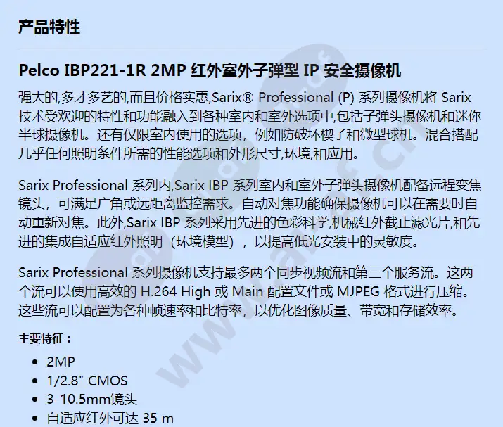 Pelco IBP221-1R 2MP 红外室外子弹型 IP 安全摄像机 强大的,多才多艺的,而且价格实惠,Sarix® Professional (P) 系列摄像机将 Sarix 技术受欢迎的特性和功能融入到各种室内和室外选项中,包括子弹头摄像机和迷你半球摄像机。还有仅限室内使用的选项,例如防破坏楔子和微型球机。混合搭配几乎任何照明条件所需的性能选项和外形尺寸,环境,和应用。 Sarix Professional 系列内,Sarix IBP 系列室内和室外子弹头摄像机配备远程变焦镜头,可满足广角或远距离监控需求。自动对焦功能确保摄像机可以在需要时自动重新对焦。此外,Sarix IBP 系列采用先进的色彩科学,机械红外截止滤光片,和先进的集成自适应红外照明(环境模型),以提高低光安装中的灵敏度。 Sarix Professional 系列摄像机支持最多两个同步视频流和第三个服务流。这两个流可以使用高效的 H.264 High 或 Main 配置文件或 MJPEG 格式进行压缩。这些流可以配置为各种帧速率和比特率,以优化图像质量、带宽和存储效率。 主要特征: 2MP 1/2.8" CMOS 3-10.5mm镜头 自适应红外可达 35 m H.264 压缩 工作温度高达 55°C (131°F) 使用 Micro SD 卡高达 64 GB 边缘存储 移动检测和摄像机破坏检测 以太网供电 (PoE) 3 类, 24 伏交流± 10% Pelco 智能压缩技术 防破坏 IK10,IP66防护等级 兼容 Pelco 和第三方视频系统 ONVIF 配置文件 S,简介 G,和 Profile Q 一致 完整的 3 年保修和支持 摄像机风格: 子弹 Compliance: 符合国防授权法案 Durability: 防风雨 Environmental: 户外的 产品系列: Pelco