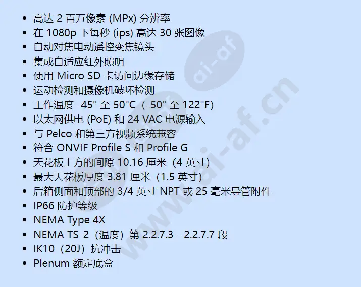 Pelco 的 IMP219-1ER 是一款微型球型摄像机,配备远程变焦镜头,可满足广角或远程监控需求。自动对焦功能确保摄像机 可以在需要时自动重新对焦。此外,IMP219-1ER 系列具有先进的色彩科学,机械红外截止滤波器和先进的集成自适应红外照明,可提高低光安装的灵敏度。 IMP219-1ER 系列摄像机最多支持两个同步视频流和第三个服务流。这两个流可以使用高效的 H.264 High 或 Main 配置文件或 MJPEG 格式进行压缩。流可以配置为各种帧速率和可变比特率,以优化图像质量以及带宽和存储效率。 IMP219-1ER 系列摄像机无缝连接到 Pelco 视频管理系统,例如 Endura 2.0 版(或更高版本)和 Digital Sentry 7.3 版(或更高版本)。 IMP219-1ER 系列摄像机通过 Pelco API 与主要的第三方视频管理系统集成,并通过开放的 ONVIF Profile S 和 Profile G 标准与其他第三方软件和系统集成。 此摄像机使用标准的 Web 浏览器界面,便于远程设置和管理。控件经过优化,可方便地一步配置摄像机功能,包括颜色,接触,闪烁控制,和流媒体。 高达 2 百万像素 (MPx) 分辨率 在 1080p 下每秒 (ips) 高达 30 张图像 自动对焦电动遥控变焦镜头 集成自适应红外照明 使用 Micro SD 卡访问边缘存储 运动检测和摄像机破坏检测 工作温度 -45° 至 50°C(-50° 至 122°F) 以太网供电 (PoE) 和 24 VAC 电源输入 与 Pelco 和第三方视频系统兼容 符合 ONVIF Profile S 和 Profile G 天花板上方的间隙 10.16 厘米(4 英寸) 最大天花板厚度 3.81 厘米(1.5 英寸) 后箱侧面和顶部的 3/4 英寸 NPT 或 25 毫米