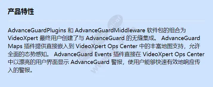 AdvanceGuardPlugins 和 AdvanceGuardMiddleware 软件包的组合为 VideoXpert 最终用户创建了与 AdvanceGuard 的无缝集成。 AdvanceGuard Maps 插件提供直接嵌入到 VideoXpert Ops Center 中的丰富地图支持,允许全面的态势感知。 AdvanceGuard Events 插件直接在 VideoXpert Ops Center 中以漂亮的用户界面显示 AdvanceGuard 警报,使用户能够快速有效地响应传入的警报。