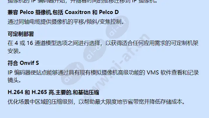 Pelco 的 NET6516-US 是机架安装编码器 16 通道,美国电源线。将现有的模拟 CCTV 视频转换为任何 VMS 都可以使用 IP 编码器系列检索的数字流。 IP 编码器使站点能够通过模拟摄像机的 VMS 软件查看和记录镜头。用户将获得网络视频解决方案的好处,而无需更换当前的模拟设备和电缆。政府设施,赌场,商业企业可以通过将现有的模拟摄像机转换为数字 IP 信号来利用这种具有成本效益的方法。这提供了一个机会,可以将现有的视频安全设备集成到最新的 IP 摄像机系统中,同时允许安全团队减少过渡时间和成本。 产品特点 简易安装 提供增强的灵活性和节省安装成本,允许客户分阶段过渡到 IP,从连接到现有模拟摄像机的 IP 编码器开始,并随着时间的推移迁移到 IP 摄像机。 兼容 Pelco 摄像机,包括 Coaxitron 和 Pelco D 通过同轴电缆提供摄像机的平移/倾斜/变焦控制。 可定制部署 在 4 或 16 通道模型选项之间进行选择,以获得适合任何应用需求的可定制机架安装。 符合 Onvif S IP 编码器使站点能够通过具有现有模拟摄像机高级功能的 VMS 软件查看和记录镜头。 H.264 和 H.265 高,主要的,和基础压缩 优化场景中区域的压缩级别,以帮助最大限度地节省带宽并降低存储成本。