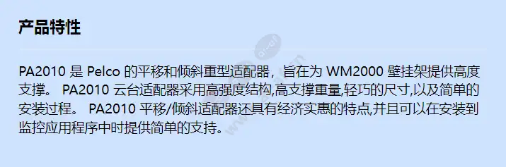 PA2010 是 Pelco 的平移和倾斜重型适配器,旨在为 WM2000 壁挂架提供高度支撑。 PA2010 云台适配器采用高强度结构,高支撑重量,轻巧的尺寸,以及简单的安装过程。 PA2010 平移/倾斜适配器还具有经济实惠的特点,并且可以在安装到监控应用程序中时提供简单的支持。