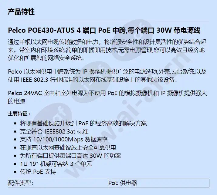 派尔高 Pelco POE430-ATUS 4 端口 30W POE 中跨