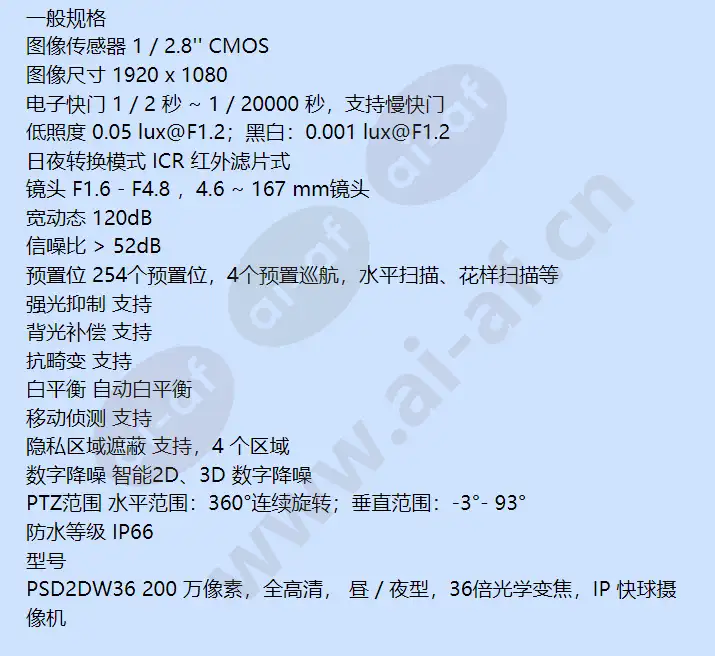 PELCO PSD2DW36 36倍悬吊高清网络快球 简单介绍 2Mega,1920x1080@30fps,1/2.8 CMOS,36倍光学变焦,4.6~167mm自动聚焦;H.265,双码流输出;彩色0.005lux/黑白0.001lux,宽动态120dB;60°水平旋转,垂直-3°~93°,255个预置位,4个预置位巡检;支持去雾,3D降噪,断电状态记忆,SD卡存储,ONVIF、GB/T28181,IP66,24VAC供电 PELCO PSD2DW36 36倍悬吊高清网络快球的详细介绍 200 万像素 IP 快球摄像机 3 6 X 光学变焦, H.265, 低照度 产品特征 1920 x 1080 全实时 ICR 红外移动滤光片自动切换,实现日夜功能 36倍光学变焦 支持 3D 降噪、数字宽动态支持 ROI 感兴趣区域编码支持去雾功能 254个预置位,4个预置巡航,水平扫描、花样扫描 H.265 / H.264 / MJPEG 压缩格式 IP66 防护等级 支持 ONVIF Profile S GB / T-28181 支持断电状态记忆功能 技术参数 一般规格 图像传感器 1 / 2.8'' CMOS 图像尺寸 1920 x 1080 电子快门 1 / 2 秒 ~ 1 / 20000 秒,支持慢快门 低照度 0.05 lux@F1.2;黑白:0.001 lux@F1.2 日夜转换模式 ICR 红外滤片式 镜头 F1.6 - F4.8 ,4.6 ~ 167 mm镜头 宽动态 120dB 信噪比 > 52dB 预置位 254个预置位,4个预置巡航,水平扫描、花样扫描等 强光抑制 支持 背光补偿 支持 抗畸变 支持 白平衡 自动白平衡 移动侦测 支持 隐私区域遮蔽 支持,4 个区域 数字降噪 智能2D、3D 数字降噪 PTZ范围 水平范围:360°连续旋转;垂直范围