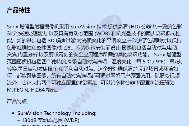 Sarix 增强型射程摄像机采用 SureVision 技术,提供高清 (HD) 分辨率,一致的色彩科学,快速处理能力,以及具有宽动态范围 (WDR) 和抗光晕技术的同步高级低光性能。新的进步包括 3D 噪声过滤,对光照变化的平滑响应,并改进了色调映射以保持色彩准确性和整体图像对比度。专为快速安装而设计,摄像机包括自动对焦,电动 变焦,内置分析,以及要求苛刻的安全应用程序所需的其他高级功能。 Sarix 增强型范围摄像机包括四个独特的,高级自动对焦选项:温度变化(每 5°C / 9°F),昼/夜转换,每日自动对焦程序,和手动自动对焦。这个好处确保清楚,无论场景或环境如何,都能聚焦图像。所有自动对焦选项都可通过网络用户界面使用。除服务视频流外,它还支持两个可独立配置的视频流。可以跨多种分辨率配置将流压缩为 MJPEG 和 H.264 格式。 产品特点 SureVision Technology, Including: – 130dB 宽动态范围 (WDR) – 先进的低光性能,0.05Lux – Anti-Bloom Technology – 3D 噪声过滤 – 增强色调映射 每秒高达 60 帧 (fps) 以太网供电 (PoE), IEEE 802.3af,24 伏, 12伏 Pelco H.264 智能压缩技术 内置分析套件 自适应红外照明可达 30 米 高达 128 GB 的 SD 卡边缘存储 与 Pelco 和第三方视频系统兼容 ONVIF 配置文件 S,简介 G,和 Profile Q 合规 RAL 9003 铝制机身带塑料隔热罩 正面和侧面IK10 摄像机可以直接安装在墙上 红外照明器