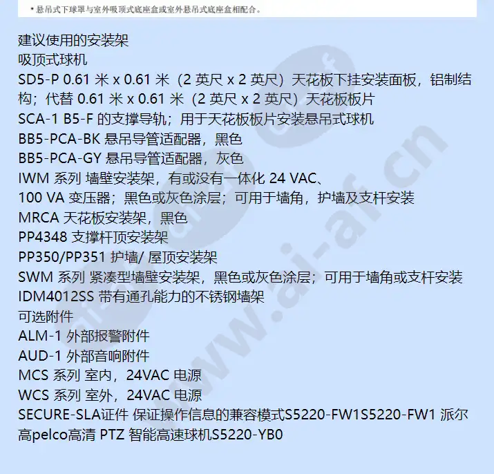 S5220-YB0 派尔高pelco高清 PTZ 智能高速球机 Spectra® HD系列网络高清快球摄像机 S5220 和S5230,高清 PTZ 智能高速球机 最高1920x1080 分辨率 16:9 高宽比;每秒30 帧图像 2 百万像素,20X 或30X 光学变焦,12X 数字变焦, 支持宽动态技术(WDR) 支持IPv4 和IPv6 网络视频监控 包括自动跟随及自适应运动检测等分析功能 2 路同步视频流:双H.264 或 单H.264加可扩展 MJPEG 360°连续水平旋转,转速可达每秒280° 支持协议:TCP/IP、UDP/IP(单播、组播 IGMP)、 UPnP、DNS、DHCP、RTP、RTSP、NTP等 支持以太网供电 (PoE)IEEE 802.3af (仅适用于 非室外型号) 电子图像稳定性(EIS)仅适用 30X S5230 报警功能及音频附件支持USB接口扩展 16个预置位巡检,多达255个预置位,32个保密区域 开放的IP 标准 符合ONVIF v1.02 网络高清快球摄像机 Pelco 携其行业率先的 Spectra® 系列球机系统进军高清世界。Spectra HD 使用标准 Web 浏览器(Microsoft®Internet Explorer® 或Mozilla® Firefox®),通过 Internet 提供 清晰的实时图像。借助 6 倍于标清球机的分辨率,SpectraHD 系列为查看面部、牌照、纹身、赌场里玩牌情况等细节提供了理想解决方案。 Spectra HD 支持 High Profile H.264 压缩制式,不仅质量较 MPEG-4 有大幅提高,效率也比 M-JPEG 提高20 倍。它还与 Digital Sentry® 视频管理系统兼容。与所有的 Pelco IP 摄 像机解决方案一样,Spectra HD 是