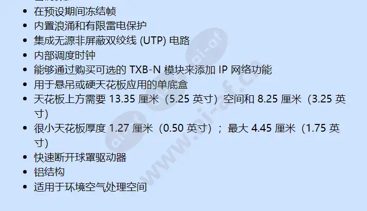 Pelco 的 SD423-F1-X 是一款 540 TVL 模拟室内黑色清晰 PTZ 摄像机,23X 镜头。它的设计考虑了易于安装和维护。每个球罩系统由三个部分组成: 一个底盒,球罩驱动器,和一个较低的球罩。还,球罩驱动器和下部球罩可以拆卸和更换,减少维护时间。 自动对焦,高分辨率集成低照度彩色摄像机/光学组件 早晚, 540电视线 23 倍光学变焦 窗口消隐 摄像机标题叠加,20个用户自定义字符 屏幕罗盘和倾斜显示 密码保护 在预设期间冻结帧 内置浪涌和有限雷电保护 集成无源非屏蔽双绞线 (UTP) 电路 内部调度时钟 能够通过购买可选的 TXB-N 模块来添加 IP 网络功能 用于悬吊或硬天花板应用的单底盒 天花板上方需要 13.35 厘米(5.25 英寸)空间和 8.25 厘米(3.25 英寸) 很小天花板厚度 1.27 厘米(0.50 英寸);最大 4.45 厘米(1.75 英寸) 快速断开球罩驱动器 铝结构 适用于环境空气处理空间