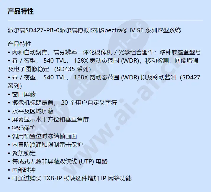 派尔高 SD427-PB-0 派尔高模拟球机Spectra® IV SE 系列球型系统 • 两种自动聚焦、高分辨率一体化摄像机 / 光学组合器件;多种底座盒型号 • 昼 / 夜型, 540 TVL, 128X 宽动态范围 (WDR),移动检测,图像增强及电子图像稳定 (SD435 系列) • 昼 / 夜型, 540 TVL, 128X 宽动态范围 (WDR) 以及移动监测(SD427 系列) • 窗口屏蔽 • 摄像机标题覆盖, 20 个用户自定义字符 • 水平及区域屏蔽 • 屏幕显示水平方位和垂直角度 • 密码保护 • 调用预置位时冻结帧画面 • 内置防浪涌和限制雷击保护 • 聚焦锁定 • 集成式无源非屏蔽双绞线 (UTP) 电路 • 内部时钟 • 可通过购买 TXB-IP 模块选件增加 IP 网络功能 模块化 Spectra® IV SE 在设计上充分考虑了安装 和维护的方便性。每个球型系统包 括三个部件:一个底盒、一个球驱动器和一个半球罩。这 3 种系统部件同 其它 Spectra IV SE 球型系统间具有互换性,方便产品的更新,简化了调试工 作。此外,球驱动器和半球罩是可拆除和可更换的,减少了维护时间。 底盒 Spectra IV SE 底盒选项包括如下型号:室外吸顶型(适用于户外建筑拱圈 内面)、室内吸顶型、室内表面安装型、标准和室外悬吊型。Spectra IV SE 系列也可订购重型、加压和不锈钢型底盒选项(有关的更多信息,请参阅相应的产品规格说明书)。每个底盒型号都有内置底盒内存,用于存储摄像机和现场球机参数,包括标识、预置位、自动巡检模式和区域。底盒中有一个无源 UTP 电路,方便通过双绞线传输视频。为了提高灵活性, 门组件还可附接 Pelco 光纤模块块,通过单模或多模光纤传输视频。 球驱动器 Spectra IV SE 球驱动器的独特一体化光学组合器件集