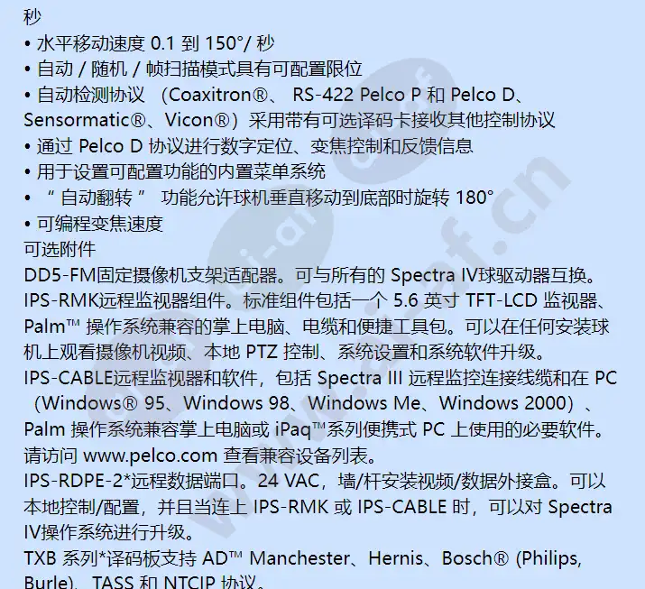 Pelco SD427-SMW-1 派尔高模拟球机 • 两种自动聚焦、高分辨率一体化摄像机 / 光学组合器件;多种底座盒型号 • 昼 / 夜型, 540 TVL, 128X 宽动态范围 (WDR),移动检测,图像增强及电子图像稳定 (SD435 系列) • 昼 / 夜型, 540 TVL, 128X 宽动态范围 (WDR) 以及移动监测(SD427 系列) • 窗口屏蔽 • 摄像机标题覆盖, 20 个用户自定义字符 • 水平及区域屏蔽 • 屏幕显示水平方位和垂直角度 • 密码保护 • 调用预置位时冻结帧画面 • 内置防浪涌和限制雷击保护 • 聚焦锁定 • 集成式无源非屏蔽双绞线 (UTP) 电路 • 内部时钟 • 可通过购买 TXB-IP 模块选件增加 IP 网络功能 模块化 Spectra® IV SE 在设计上充分考虑了安装 和维护的方便性。每个球型系统包 括三个部件:一个底盒、一个球驱动器和一个半球罩。这 3 种系统部件同 其它 Spectra IV SE 球型系统间具有互换性,方便产品的更新,简化了调试工 作。此外,球驱动器和半球罩是可拆除和可更换的,减少了维护时间。 底盒 Spectra IV SE 底盒选项包括如下型号:室外吸顶型(适用于户外建筑拱圈 内面)、室内吸顶型、室内表面安装型、标准和室外悬吊型。Spectra IV SE 系列也可订购重型、加压和不锈钢型底盒选项(有关的更多信息,请参阅相应的产品规格说明书)。每个底盒型号都有内置底盒内存,用于存储摄像机和现场球机参数,包括标识、预置位、自动巡检模式和区域。底盒中有一个无源 UTP 电路,方便通过双绞线传输视频。为了提高灵活性, 门组件还可附接 Pelco 光纤模块块,通过单模或多模光纤传输视频。 球驱动器 Spectra IV SE 球驱动器的独特一体化光学组合器件集成了众多的先进功 能,使系统即使是在