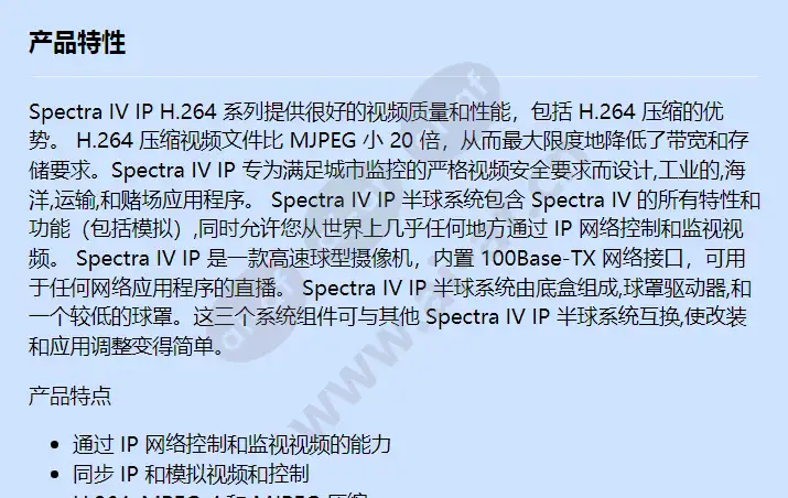 Spectra IV IP H.264 系列提供很好的视频质量和性能,包括 H.264 压缩的优势。 H.264 压缩视频文件比 MJPEG 小 20 倍,从而最大限度地降低了带宽和存储要求。Spectra IV IP 专为满足城市监控的严格视频安全要求而设计,工业的,海洋,运输,和赌场应用程序。 Spectra IV IP 半球系统包含 Spectra IV 的所有特性和功能(包括模拟),同时允许您从世界上几乎任何地方通过 IP 网络控制和监视视频。 Spectra IV IP 是一款高速球型摄像机,内置 100Base-TX 网络接口,可用于任何网络应用程序的直播。 Spectra IV IP 半球系统由底盒组成,球罩驱动器,和一个较低的球罩。这三个系统组件可与其他 Spectra IV IP 半球系统互换,使改装和应用调整变得简单。 产品特点 通过 IP 网络控制和监视视频的能力 同步 IP 和模拟视频和控制 H.264, MPEG-4,和 MJPEG 压缩 支持的协议:TCP/IP, UDP/IP(单播,组播 IGMP),通用即插即用,域名系统,DHCP,实时传输协议, RTSP协议,NTP,IPv4, SNMP,服务质量,HTTP, HTTPS,LDAP(客户端), SSH, SSL,邮件传输协议,文件传输协议,和 802.1x (EAP) 多级密码保护 3 自动对焦,高分辨率集成摄像机/光学组件 Autotracking 水平区域和窗口消隐 屏幕罗盘和倾斜显示 最多 2 个同步视频流 网络浏览,同时最多16台摄像机 开放IP标准 ONVIF v1.02 Conformant 双向全双工音频 36 倍光学变焦,天花板安装,黑底盒(白环),烟色下球罩,制式
