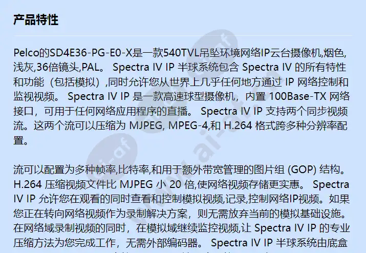 Pelco的SD4E36-PG-E0-X是一款540TVL吊坠环境网络IP云台摄像机,烟色,浅灰,36倍镜头,PAL。 Spectra IV IP 半球系统包含 Spectra IV 的所有特性和功能(包括模拟),同时允许您从世界上几乎任何地方通过 IP 网络控制和监视视频。 Spectra IV IP 是一款高速球型摄像机,内置 100Base-TX 网络接口,可用于任何网络应用程序的直播。 Spectra IV IP 支持两个同步视频流。这两个流可以压缩为 MJPEG, MPEG-4,和 H.264 格式跨多种分辨率配置。 流可以配置为多种帧率,比特率,和用于额外带宽管理的图片组 (GOP) 结构。 H.264 压缩视频文件比 MJPEG 小 20 倍,使网络视频存储更实惠。 Spectra IV IP 允许您在观看的同时查看和控制模拟视频,记录,控制网络IP视频。如果您正在转向网络视频作为录制解决方案,则无需放弃当前的模拟基础设施。在网络域录制视频的同时,在模拟域继续监控视频,让 Spectra IV IP 的专业压缩方法为您完成工作,无需外部编码器。 Spectra IV IP 半球系统由底盒组成,球罩驱动器,和一个较低的球罩。这三个系统组件可与其他 Spectra IV IP 半球系统互换,使改装和应用调整变得简单。 Spectra IV IP 具有多个底盒选项。所有底盒均具有内置内存,可用于存储摄像机和特定位置的球机设置,包括标签,预设,模式,和区域。 Spectra IV IP 半球驱动器中的所有摄像机均配备 EXview HAD 成像器以提高灵敏度,并采用 LowLight 技术,使摄像机能够补偿存在微弱光线的场景。 29X 和 36X 摄像机都具有内置运动检测和先进的 128X 宽动态范围 (WDR),使系统能够补偿存在强烈光照对比的场景。 36X 日/夜