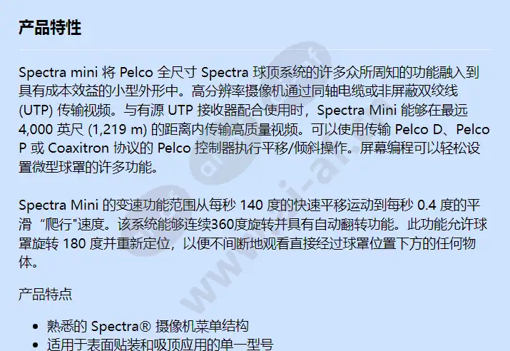 Spectra mini 将 Pelco 全尺寸 Spectra 球顶系统的许多众所周知的功能融入到具有成本效益的小型外形中。高分辨率摄像机通过同轴电缆或非屏蔽双绞线 (UTP) 传输视频。与有源 UTP 接收器配合使用时,Spectra Mini 能够在最远 4,000 英尺 (1,219 m) 的距离内传输高质量视频。可以使用传输 Pelco D、Pelco P 或 Coaxitron 协议的 Pelco 控制器执行平移/倾斜操作。屏幕编程可以轻松设置微型球罩的许多功能。 Spectra Mini 的变速功能范围从每秒 140 度的快速平移运动到每秒 0.4 度的平滑“爬行"速度。该系统能够连续360度旋转并具有自动翻转功能。此功能允许球罩旋转 180 度并重新定位,以便不间断地观看直接经过球罩位置下方的任何物体。 产品特点 熟悉的 Spectra® 摄像机菜单结构 适用于表面贴装和吸顶应用的单一型号 自动对焦,高分辨率集成彩色摄像机/光学组件 80 倍变焦(10 倍光学,8倍数码) 区域消隐 64个预设 0.5°预置精度 140°/秒摇摄速度 Rotating Discreet Liner 1个图案 1个动态窗口消隐区 比例平移和倾斜 可编程变焦速度 多语言支持 不可缺少的,自动感应,多协议接收器 自动翻转球罩旋转 集成UTP电路 电源快速连接电缆,视频(同轴或 UTP),和数据 适用于烟色半球摄像机