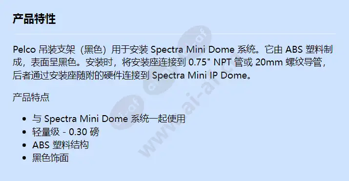 Pelco 吊装支架(黑色)用于安装 Spectra Mini Dome 系统。它由 ABS 塑料制成,表面呈黑色。安装时,将安装座连接到 0.75" NPT 管或 20mm 螺纹导管,后者通过安装座随附的硬件连接到 Spectra Mini IP Dome。 产品特点 与 Spectra Mini Dome 系统一起使用 轻量级 - 0.30 磅 ABS 塑料结构 黑色饰面