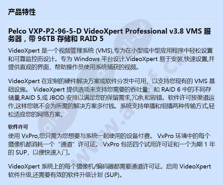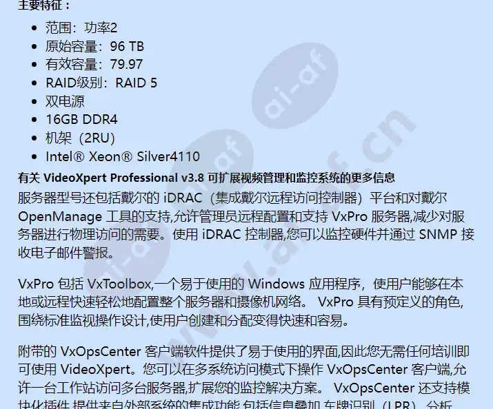 Pelco VXP-P2-96-5-D VideoXpert Professional v3.8 VMS 服务器,带 96TB 存储和 RAID 5 VideoXpert 是一个视频管理系统 (VMS),专为在小型或中型应用程序中轻松设置和可靠监控而设计。专为 Windows 平台设计,VideoXpert 易于安装,快速设置,并提供直观的界面,帮助操作员使用系统捕获的视频。 VideoXpert 在定制的硬件解决方案或软件分发中可用,以支持您现有的 VMS 基础设施。 VideoXpert 提供选项来支持您需要的吞吐量;和 RAID 6 中的不同存储量,RAID 5,或 JBOD 安排以满足您的保留需求,冗余,和容错。软件许可按渠道运作,这样您就不会为所需的解决方案多付钱。系统支持单播和组播两种传输方式,轻松适应您的网络方案。 软件许可 使用 VxPro,您只需为您想要与系统一起使用的设备付费。 VxPro 环境中的每个摄像机都消耗一个“通道”许可证。 VxPro 包括四个试用许可证和一个为期 1 年的 SUP,以便快速入门。 VideoXpert 系统上的每个摄像机/编码器都需要通道许可证。启用 VideoXpert 软件升级,还需要有效的软件升级计划 (SUP)。 主要特征: 范围:功率2 原始容量:96 TB 有效容量:79.97 RAID级别:RAID 5 双电源 16GB DDR4 机架(2RU) Intel® Xeon® Silver4110 有关 VideoXpert Professional v3.8 可扩展视频管理和监控系统的更多信息 服务器型号还包括戴尔的 iDRAC(集成戴尔远程访问控制器)平台和对戴尔 OpenManage 工具的支持,允许管理员远程配置和支持 VxPro 服务器,减少对服务器进行物理访问的需要。使用 iDRAC 控制器,您可以监控