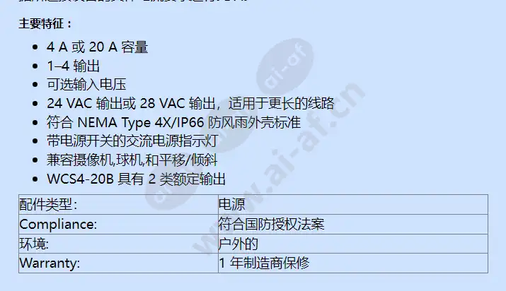 Pelco WCS4-20B 室外多摄像机电源 20 安培 4 输出断路器 WCS 系列电源提供多种配置,可通过单个电源为最多四个室外设备供电。电源为 1–4 台设备提供 24 VAC 输出,取决于所选型号。补偿长距离线路的电压损失,所有型号均提供 28 VAC 输出。所有型号的输入电压也是可选的。适用于 Spectra® 和 Esprit® 等集成系统,电源能够处理平移/倾斜,加热器,除了摄像机之外,还有鼓风机操作。 WCS1-4 具有一个带保险丝的输出,能够处理高达 4 A (100 VA) 的总负载。 WCS4-20 具有四个带保险丝的输出,能够处理高达 20 A (480 VA) 的总负载。 WCS4-20B 具有四个带自复位断路器的受保护输出,能够处理高达 12 A (288 VA) 的总负载。保险丝为设备提供更大程度的保护,因为它们动作更快且更精确。当故障排除后,断路器将自动复位,无需更换保险丝。然而,使断路器跳闸所需的电流量可能变化高达 100%,取决于温度。在融合模型中,保险丝的值可以根据所连接设备的具体电流要求进行更改。 主要特征: 4 A 或 20 A 容量 1–4 输出 可选输入电压 24 VAC 输出或 28 VAC 输出,适用于更长的线路 符合 NEMA Type 4X/IP66 防风雨外壳标准 带电源开关的交流电源指示灯 兼容摄像机,球机,和平移/倾斜 WCS4-20B 具有 2 类额定输出 配件类型: 电源 Compliance: 符合国防授权法案 Environmental: 户外的 Warranty: 1 年制造商保修