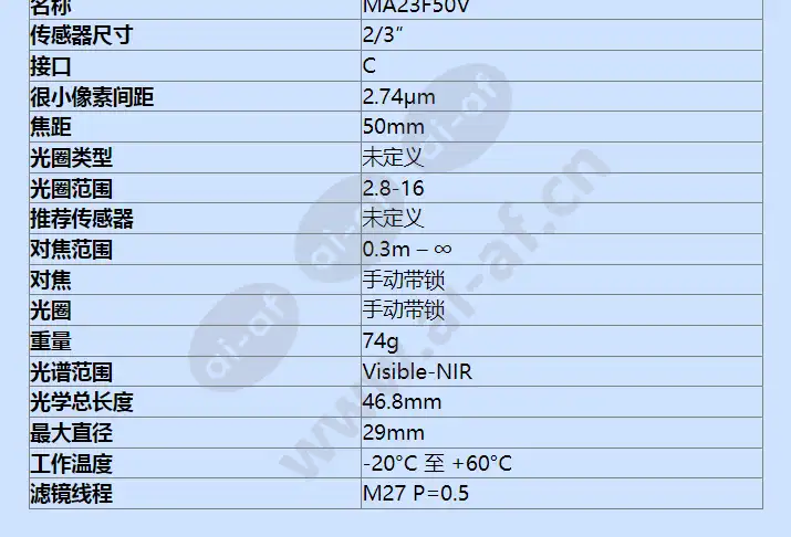 机器视觉镜头 MA23F50V 全新 MA23F 镜头系列专为 2/3 英寸图像传感器打造,分辨率高达 8 百万像素,像素间距为 2.74µm。焦距有 8、12、16、25、35 和 50mm。与上一代 2/3 英寸镜头相比,该系列在分辨率、失真和尺寸方面均有改进。 其坚固的机械设计和机身直径仅为 29 毫米的紧凑尺寸是其他附加特点,使该镜头系列成为各种复杂应用的选择。 传感器尺寸 2/3" 焦距 50mm 光圈范围 2.8-16 光圈 手动带锁 产品规格 属性 值 名称 MA23F50V 传感器尺寸 2/3″ 接口 C 很小像素间距 2.74μm 焦距 50mm 光圈类型 未定义 光圈范围 2.8-16 推荐传感器 未定义 对焦范围 0.3m – ∞ 对焦 手动带锁 光圈 手动带锁 重量 74g 光谱范围 Visible-NIR 光学总长度 46.8mm 最大直径 29mm 工作温度 -20°C 至 +60°C 滤镜线程 M27 P=0.5