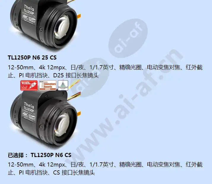 美国 Theia TL1250P N6 CS 12-50mm 4k 12 MP 日/夜 1/1.7 英寸 精确光圈 电动变焦和对焦 红外截止 PI 电机挡块 CS 接口 长焦镜头