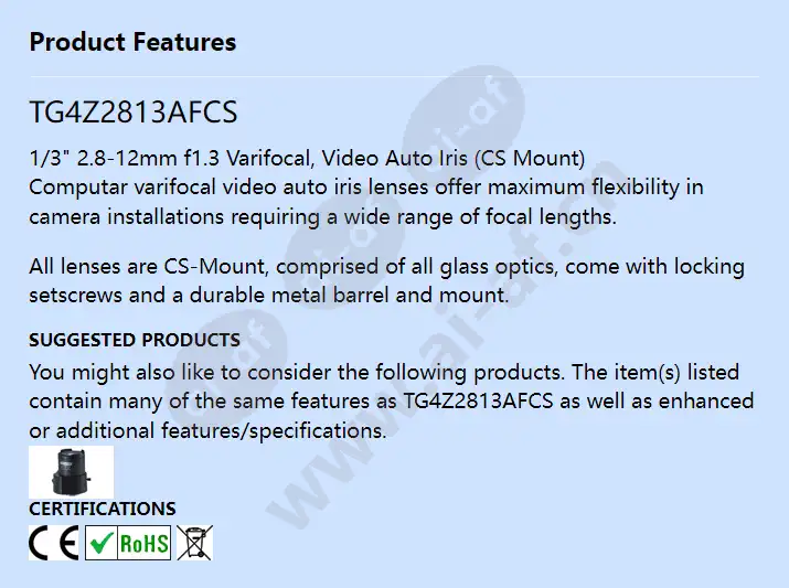 TG4Z2813AFCS 1/3" 2.8-12mm f1.3 Varifocal, Video Auto Iris (CS Mount) Computar varifocal video auto iris lenses offer maximum flexibility in camera installations requiring a wide range of focal lengths. All lenses are CS-Mount, comprised of all glass optics, come with locking setscrews and a durable metal barrel and mount. SUGGESTED PRODUCTS You might also like to consider the following products. The item(s) listed contain many of the same features as TG4Z2813AFCS as well as enhanced or additional features/specifications. CERTIFICATIONS