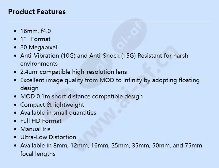 16mm, f4.0 1” Format 20 Megapixel Anti-Vibration (10G) and Anti-Shock (15G) Resistant for harsh environments 2.4um-compatible high-resolution lens Excellent image quality from MOD to infinity by adopting floating design MOD 0.1m short distance compatible design Compact & lightweight Available in small quantities Full HD Format Manual Iris Ultra-Low Distortion Available in 8mm, 12mm, 16mm, 25mm, 35mm, 50mm, and 75mm focal lengths