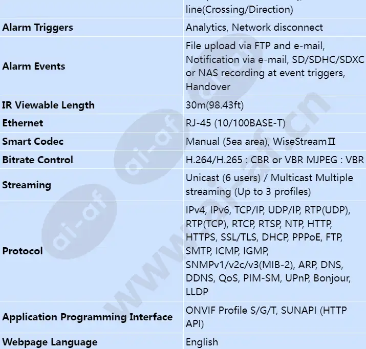 • 4MP resolution, Up to 30fps • Color : 0.1Lux (F1.6, 1/30sec), B/W : 0Lux (IR LED On) • 3.3 ~ 10.3mm motorized varifocal lens • IR viewable length: 30m (98.42ft) • Day & Night (ICR), WDR (120dB) • H.265, H.264, MJPEG, Multiple streaming supported • Defocus detection, Directional detection, Motion detection, Enter/Exit, Tampering • Hallway view (90⁰/270⁰), LDC support, WiseStream II • Micro SD/SDHC/SDXC memory slot (Max. 128GB) • IP66 NDAA and FCC Compliant Camera and NVR Solutions A series product line includes cost-effective camera and NVR solutions equipped with the essential functionality security professionals demand. Affordability without sacrificing features makes it well suited to meet the needs of small to medium sized sites such as retail, banking, and commercial locations. A