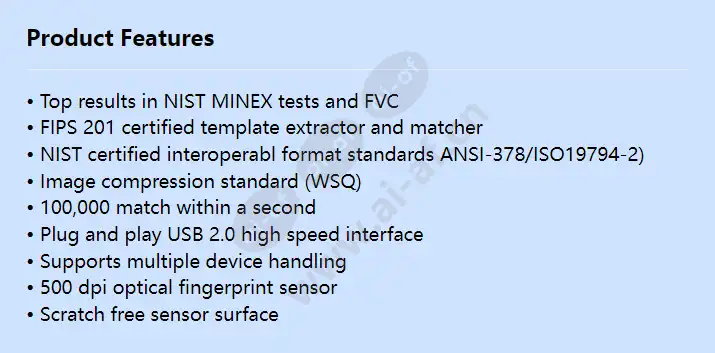 • Top results in NIST MINEX tests and FVC • FIPS 201 certified template extractor and matcher • NIST certified interoperabl format standards ANSI-378/ISO19794-2) • Image compression standard (WSQ) • 100,000 match within a second • Plug and play USB 2.0 high speed interface • Supports multiple device handling • 500 dpi optical fingerprint sensor • Scratch free sensor surface