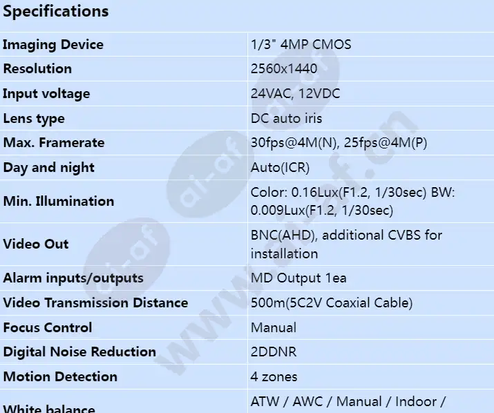 • QHD (2560 x 1440, 30fps) resolution • 0.16 Lux@F1.2 (Color), 0.009 Lux@F1.2 (B/W) • Day & Night (ICR), DWDR, Motion detection • Transmission distance Max. 500m • Easy installation (Plug & play), Dual power Imaging Device 1/3" 4MP CMOS Resolution 2560x1440 Max. Framerate 30fps@4M(N), 25fps@4M(P) Min. Illumination Color: 0.16Lux(F1.2, 1/30sec) BW: 0.009Lux(F1.2, 1/30sec) Video Out BNC(AHD), additional CVBS for installation Video Transmission Distance 500m(5C2V Coaxial Cable) Focus Control Manual Lens Type DC auto iris Mount Type C mount, CS mount Day & Night Auto(ICR) Backlight Compensation UserBLC, HLC, DWDR Digital Noise Reduction 2DDNR Motion Detection 4 zones Privacy Masking 2 zones Gain Control Low / Middle / High / Very High White Balance ATW / AWC / Manual / Indoor / Outdoor