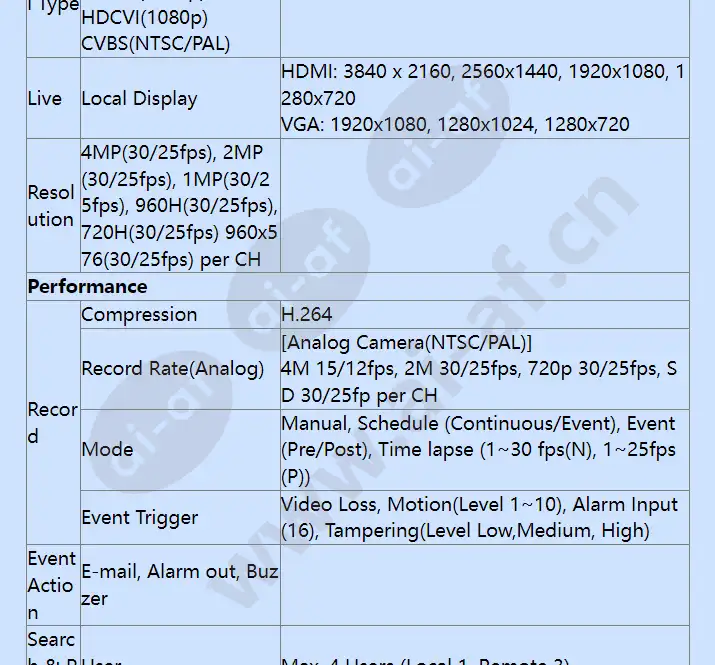 Samsung HRD-440-4TB 4 Channel 4MP Analog HD Digital Video Recorder Key Features: 4 Channel 4MP AHD DVR 4TB HDD included TVI, CVI (Max. 2MP), Analog camera input 4TB HDD included Up to 60/ 50 (4MP)fps recording rate Up to 120 / 100 (1080p)fps recording rate HDMI / VGA video output 1CH audio input / 1CH audio output Up to 1 internal HDD (Max.6TB) Coaxial cable (Pelco-C, ACP) Smartphone support Analog camera Inputs 4CH(1Vp-p 75ohm, BNC) Signal Type AHD(4MP, 1080p, 720p) HDTVI(1080p) HDCVI(1080p) CVBS(NTSC/PAL) Live Local Display HDMI: 3840 x 2160, 2560x1440, 1920x1080, 1280x720 VGA: 1920x1080, 1280x1024, 1280x720 Resolution 4MP(30/25fps), 2MP(30/25fps), 1MP(30/25fps), 960H(30/25fps), 720H(30/25fps) 960x576(30/25fps) per CH Performance Record Compression H.264 Record Rate(Analog) [Analog