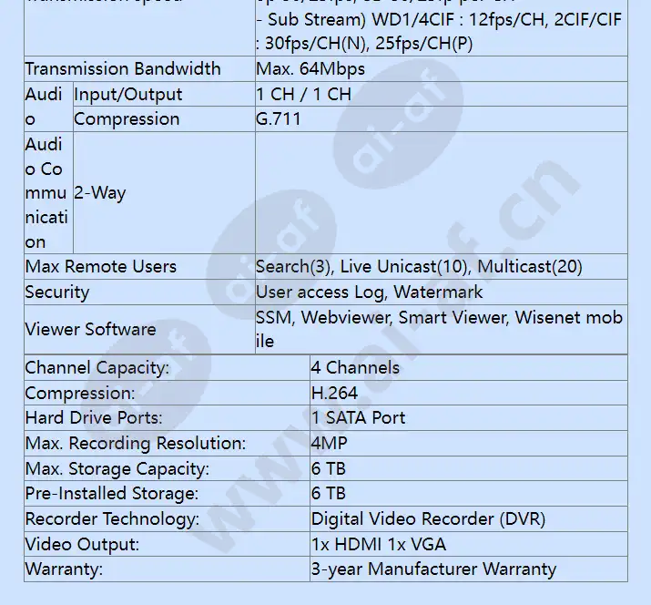Samsung HRD-440-6TB 4 Channel 4MP Analog HD DVR Digital Video Recorder Key Features: 4 Channel 4MP AHD DVR 6TB HDD included TVI, CVI (Max. 2MP), Analog camera input Up to 60/ 50 (4MP)fps recording rate 6TB HDD included Up to 120 / 100 (1080p)fps recording rate HDMI / VGA video output 1CH audio input / 1CH audio output Up to 1 internal HDD (Max.6TB) Coaxial cable (Pelco-C, ACP) Smartphone support Analog camera Inputs 4CH(1Vp-p 75ohm, BNC) Signal Type AHD(4MP, 1080p, 720p) HDTVI(1080p) HDCVI(1080p) CVBS(NTSC/PAL) Live Local Display HDMI: 3840 x 2160, 2560x1440, 1920x1080, 1280x720 VGA: 1920x1080, 1280x1024, 1280x720 Resolution 4MP(30/25fps), 2MP(30/25fps), 1MP(30/25fps), 960H(30/25fps), 720H(30/25fps) 960x576(30/25fps) per CH Performance Record Compression H.264 Record Rate(Analog) [Analog
