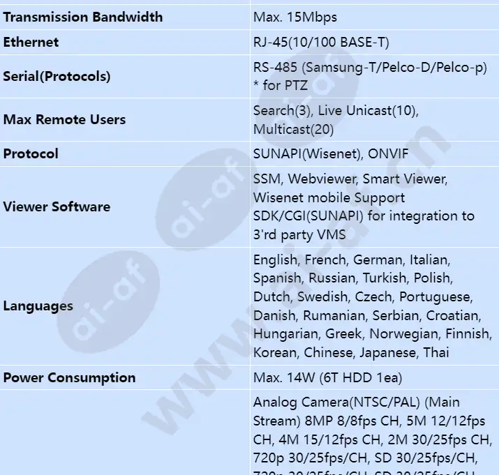 • 5-in-1 4CH Pentabrid DVR • AHD/HDTVI/HDCVI/CVBS/IP inputs • Max. Analog 4CH + NW 2CH(Max. 6CH), up to 8MP • H.265, H.264, MJPEG • 8fps@8MP, 12fps@5MP, 30fps@2MP recording • Coaxial control • Smart search(only Network camera) • 1 SATA HDD(6TB) • HDMI/VGA • P2P service(QR code connect) Inputs 4CH(1Vp-p 75ohm, BNC) Signal Type AHD(8MP, 5MP, 4MP, 1080p, 720p) HDTVI(8MP, 5MP, 4MP, 1080p, 720p) HDCVI(5MP, 4MP, 1080p, 720p) CVBS(NTSC/PAL) Resolution 8MP ~ CIF Protocols SUNAPI(Wisenet), ONVIF Local Display HDMI: 3840 x 2160, 1920x1080, 1280x720 VGA: 1920x1080, 1280x720 Compression H.265, H.264, MJPEG Record Rate(Analog) Analog Camera(NTSC/PAL) (Main Stream) 8MP 8/8fps CH, 5M 12/12fps CH, 4M 15/12fps CH, 2M 30/25fps CH, 720p 30/25fps/CH, SD 30/25fps/CH (Sub Stream) 720p or higher : 640x360 full