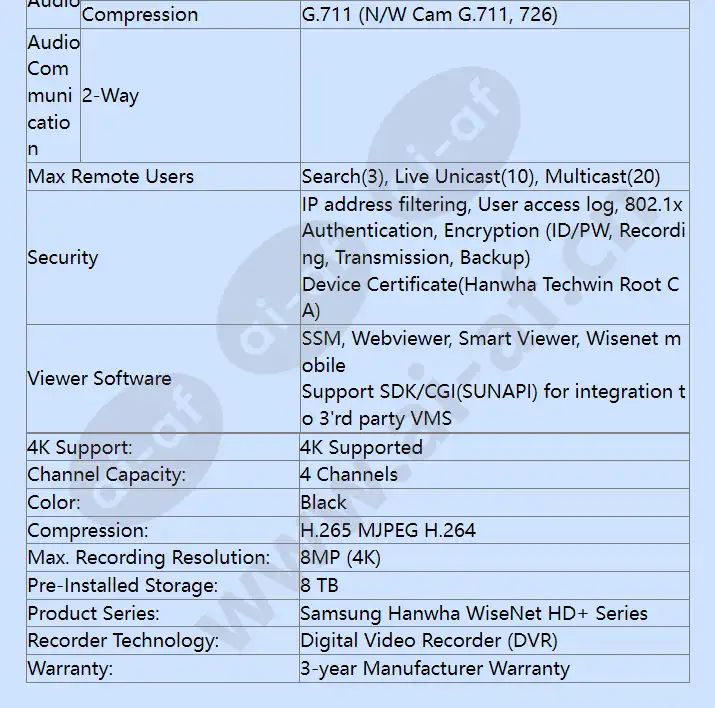 Samsung Hanwha HRX-421-8TB 4 Channel Pentabrid Digital Video Recorder Key Features: 5-in-1 4CH Pentabrid DVR 8 TB HDD included AHD/HDTVI/HDCVI/CVBS/IP inputs Max. Analog 4CH + NW 2CH (Max. 6CH), up to 8MP H.265, H.264, MJPEG 8fps@8MP, 12fps@5MP, 30fps@2MP recording Coaxial control Smart search (only Network camera) Up to 2 SATA HDDs (6TB/HDD) HDMI/VGA monitor P2P service(QR code connect) Analog camera Inputs 4CH(1Vp-p 75ohm, BNC) Signal Type AHD(8MP, 5MP, 4MP, 1080p, 720p) HDTVI(8MP, 5MP, 4MP, 1080p, 720p) HDCVI(5MP, 4MP, 1080p, 720p) CVBS(NTSC/PAL) Network camera Inputs Max. 6CH Resolution 8MP ~ CIF Protocols SUNAPI(Wisenet), ONVIF Live Local Display HDMI: 3840 x 2160, 1920x1080, 1280x720 VGA: 1920x1080, 1280x720 Resolution [Ananlg Camera(NTSC/PAL)] - 8MP(15/12fps), 5MP(20/12fps)