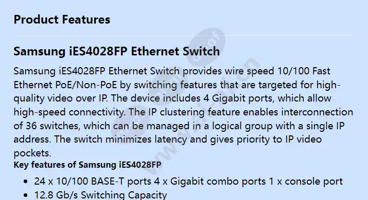 Samsung iES4028FP Ethernet Switch Samsung iES4028FP Ethernet Switch provides wire speed 10/100 Fast Ethernet PoE/Non-PoE by switching features that are targeted for high-quality video over IP. The device includes 4 Gigabit ports, which allow high-speed connectivity. The IP clustering feature enables interconnection of 36 switches, which can be managed in a logical group with a single IP address. The switch minimizes latency and gives priority to IP video pockets. Key features of Samsung iES4028FP 24 x 10/100 BASE-T ports 4 x Gigabit combo ports 1 x console port 12.8 Gb/s Switching Capacity Forwarding rate: 9.5 Mpps 100 to 240 V, 50 to 60 Hz AC input 30 W Power consumption Network Interface: 10/100 BASE-T ports 10/100/1000 BASE-T ports SFP transceiver slots supporting SX, LX, and ZX SFP
