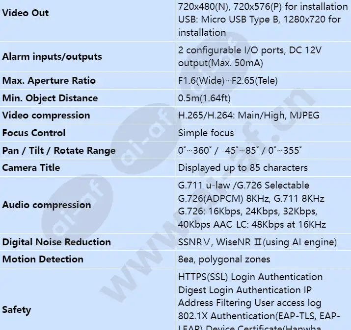• Maximum 4K resolution • 0.05Lux@F1.6 (Color), 0Lux (B/W, IR LED on) • Day & Night(ICR), WDR(120dB), WiseNRⅡ (Using AI engine), Prefer Shutter • H.265, H.264, MJPEG codec, WiseStreamⅡ, WiseStreamⅢ (Using AI engine) • Video Analytics based on AI - Object detection and classification(Person, Face, Vehicle, License Plate) - Face mask detection, Social distancing detection - Attribute, BestShot • Modular structure for easy installation • Requires camera firmware v1.41.03 or later to use Face Mask Detection • System requirements - SSM v2.10.8 or later, Genetec plugin v1.0 or later, Milestone plugin v1.0.2 or later Reducing false alarm based on deep learning technology P series AI cameras using AI algorithms filter out irrelevant movements caused by environmental changes such as waving trees