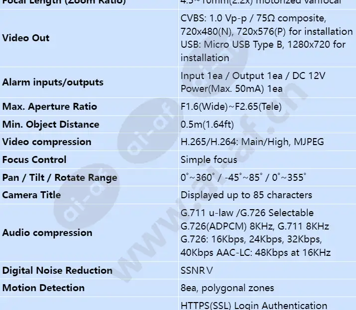 • Max. 4K resolution • 0.05Lux@F1.6 (Color), 0Lux (B/W, IR LED on) • Day & Night(ICR), WDR(120dB) • IR Viewable Length 30m (98.42ft) • H.265, H.264, MJPEG codec, WiseStreamⅡ • Wisenet Road AI application (Pre-installed) - License/Number Plate Recognition - Make/Model/Color Recognition - Black/White list notification - Smart Search (LP/NP, Country, brand, model, color) Imaging Device 1/1.8" CMOS Resolution 3840x2160, 3072x1728, 2592x1944, 2688x1520, 2560x1440, 2048x1536, 1920x1080, 1600x1200, 1280x1024,1280x960, 1280x720, 1024x768, 800 x 600, 800 x 448, 720 x 576, 720x480, 640x480, 640x360 Max. Framerate H.265/H.264: Max. 30fps/25fps(60Hz/50Hz) MJPEG: Max. 30fps/25fps(60Hz/50Hz) Min. Illumination Color: 0.05Lux(F1.6, 1/30sec) BW: 0.005Lux(F1.6, 1/30sec), 0Lux(IR LED on) Video Out CVBS: 1.0