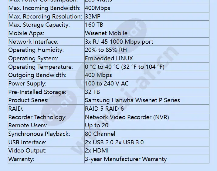 Samsung Hanwha PRN-3200B4-32TB 8K 32 Channel 400Mbps AI Network Video Recorder, 32TB Storage Key Features: 8K NVR, up to 32channels, License-free recording Supports H.265, H.264, & MJPEG CODECs, Up to 16 fixed internal SATA HDDs (10TB max per HDD), RAID 5 & 6 recording ARB (Automatic Recovery Backup) 400 Mbps recording / up to 32 Mbps playback Dual stream recording, WiseStream technology HDMI/VGA dual display, max. resolution of 32MP recording/display Add AI search capabilities to select P, X and Q series Hanwha Cameras AI search (Wisenet AI cameras only) web UI 2.0 (no plugins required) P2P / QR Code for easy connection to Wisenet Viewer / Wisenet Mobile NDAA & FCC Compliant 4K Support: 4K Supported Alarm Input: 8 Channel Alarm Output: 4 Channel Audio Capability: Two-Way Audio Audio