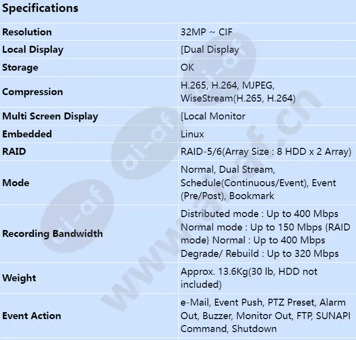 • Up to 8K (32MP) Resolution • AI search (BestShot, Attribute) • Object detection and classification • SATA 16ea (Up to 160TB) • Easy Channel/Event/Alarm configuration • Video preview support • Dynamic Event support • Bookmark management (Up to 100 set) • Simple connection with mobile phone through QR code AI enhances accuracy and efficiency Wisenet AI NVRs can play and record high resolution videos of up to 8K. It greatly enhances operational efficiency with the object analysis (Detection of Human, face, vehicle, license plate), and license plate recognition through AI search. License Plate Recognition (LPR) Through OCR (Optical Character Recognition) processing, the BestShot images of the license plates are converted into machine-readable text and numbers and stored in the Wisenet AI