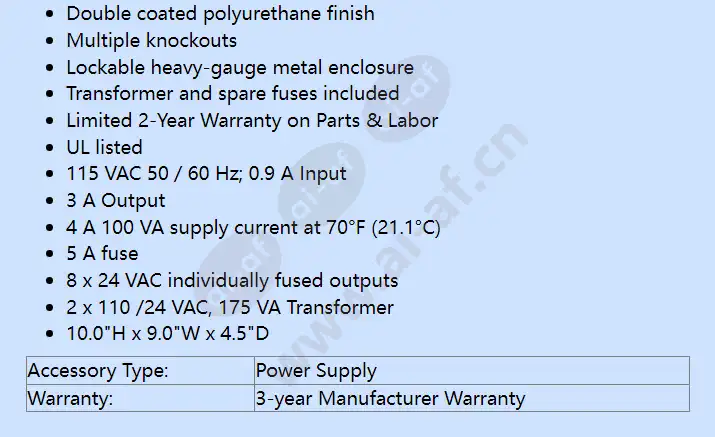 Samsung PWR-24AC-8-4UL Power Supply CCTV systems stay up and running with the Samsung PWR-24AC-8-4UL Power Supply. This unit is a CCTV power center and distributes power to remote camera and accessories. A total of 24VAC is distributed to eight fused outputs, and there is continuous supply of 4A current. A heavy-gauge metal enclosure keeps the unit safe from impact and element damages. Key features of Samsung PWR-24AC-8-4UL Screw and terminal and fuse access Individual LED's for each fused output AC power LED indicator Power On/Off switch Double coated polyurethane finish Multiple knockouts Lockable heavy-gauge metal enclosure Transformer and spare fuses included Limited 2-Year Warranty on Parts & Labor UL listed 115 VAC 50 / 60 Hz; 0.9 A Input 3 A Output 4 A 100 VA supply current at 70°F