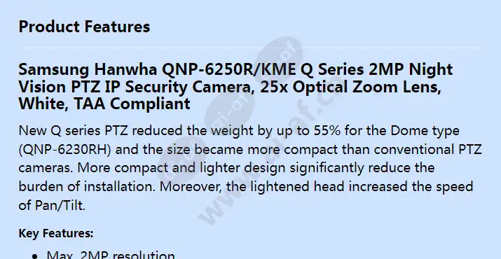 Samsung Hanwha QNP-6250R/KME Q Series 2MP Night Vision PTZ IP Security Camera, 25x Optical Zoom Lens, White, TAA Compliant New Q series PTZ reduced the weight by up to 55% for the Dome type (QNP-6230RH) and the size became more compact than conventional PTZ cameras. More compact and lighter design significantly reduce the burden of installation. Moreover, the lightened head increased the speed of Pan/Tilt. Key Features: Max. 2MP resolution 4.44 to 111mm (25x) lens Max. IR viewable length 328.08ft (100m) Day and Night (ICR), WDR, DIS (Built-in gyro sensor) Intelligent Analytics H.264, H.265, MJPEG codec, WiseStreamII Micro SD/SDHC/SDXC 1slot 256GB IP66, IK10, NEMA4X Alternative SKUs: SQ-QP625RKME Compliance: TAA (Trade Agreements Act) Product Series: Samsung Hanwha Wisenet Q Series