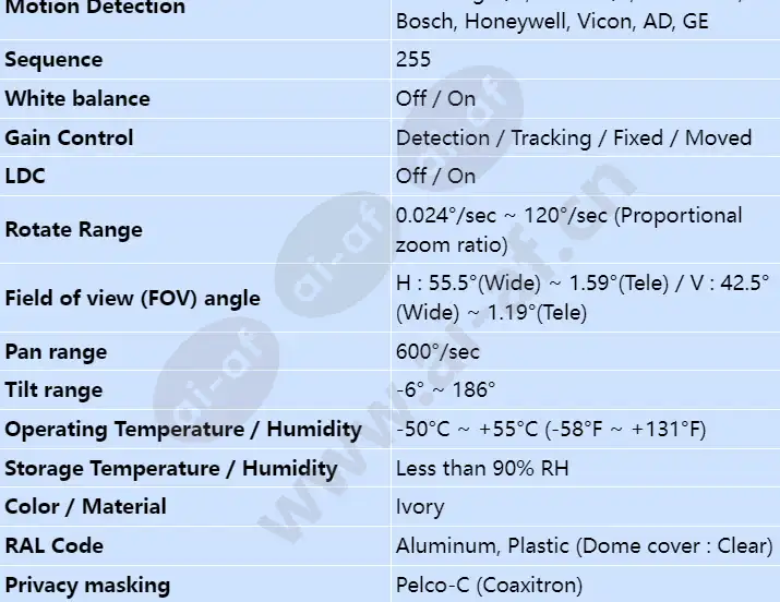 • High resolution of 600TV lines (Color), 700TV lines (B/W) • Min. illumination 0.7Lux (Color), 0.07Lux (B/W) • Powerful 37x zoom (3.5 ~ 129.5mm), digital 16x • WDR, VPS, true Day & Night (ICR), intelligent video, MD, SSNRIII • IP66, Coax : Pelco-C (Coaxitron), RS-485, 24V AC Imaging Device 1/4" Ex-view HAD CCD NETD 2 : 1 Interlace Pixel Size Color : 600TV lines Min. Illumination 0.7Lux@F1.6 (50IRE), 0.001Lux (Sens-up, 512x) Video Out CVBS : 1.0 Vp-p / 75Ω composite Focal Length (Zoom Ratio) 3.5 ~ 129.5mm Max. Aperture Ratio 1 : 1.6(Wide) ~ 3.9(Tele) Angular Field of View H : 55.5°(Wide) ~ 1.59°(Tele) / V : 42.5°(Wide) ~ 1.19°(Tele) Min. Object Distance 1.8m (5.91ft) Pan / Tilt / Rotate Range 360° Endless Pan Range 600°/sec Pan Speed 0.024°/sec ~ 120°/sec (Proportional zoom ratio) Tilt