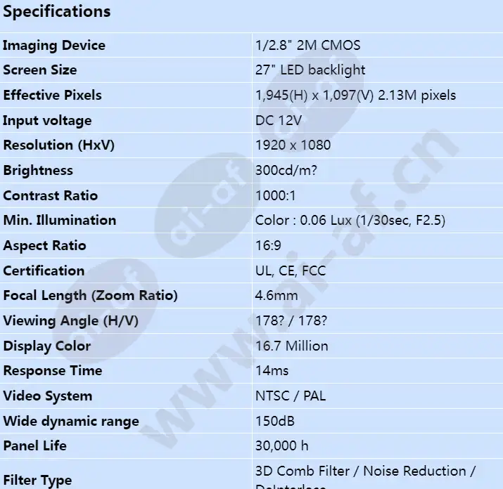 Support up to 1,920 x 1,080 resolution Contrast ratio 1000:1 Fast response time 5ms Video input : HDMI, VGA, BNC Screen Size 27" LED backlight Resolution (HxV) 1920 x 1080 Brightness 300cd/m? Contrast Ratio 1000:1 Aspect Ratio 16:9 Viewing Angle (H/V) 178? / 178? Display Color 16.7 Million Response Time 14ms Video System NTSC / PAL Panel Life 30,000 h Filter Type 3D Comb Filter / Noise Reduction / DeInterlace Key feature Text overlay and blinking "Recording in progress", Slide show Display connector 1 HDMI In Network Connector 1 RJ-45 Reset(For Cam) Yes Language English, Spanish, French, German, Italian Memory Slot Micro SD/SDHC/SDXC (Max 256GB) Alarm In 1/ Out 1 Operating temperature/humidity 0 ~ 50? C / 40?90%, 50?50% Storage temperature/humidity -20 ~ 60? C / 40?90%, 60?35%